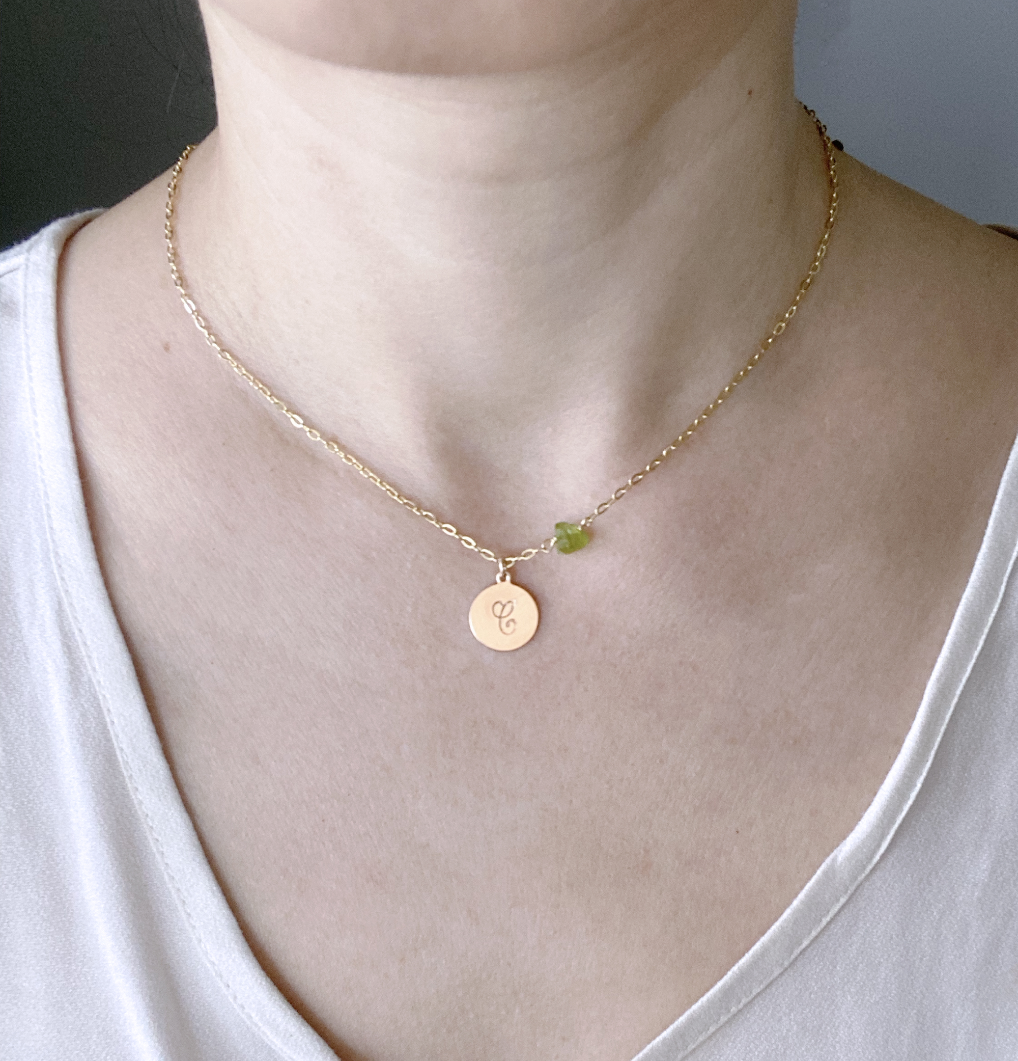 A beautiful gold filled necklace with a custom initial disc and a gorgeous raw birthstone at the side.