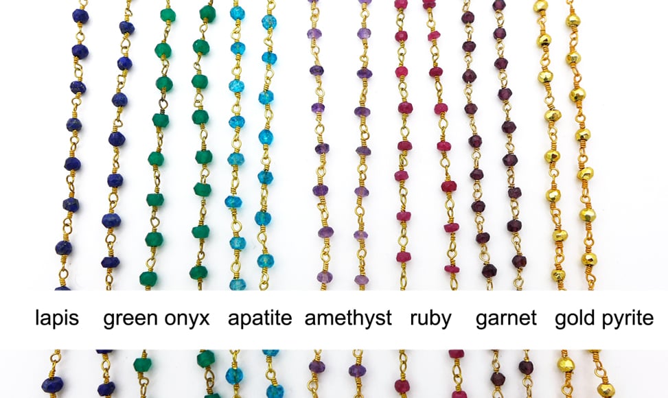 These natural crystal points have been finished with a gold plated cap and dangles from a long wire wrapped gemstone / rosary vermeil chain.