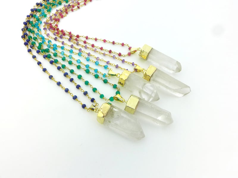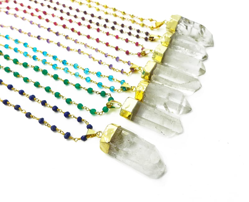 Inject some fun into your outfit with our wire wrapped gemstone crystal quartz point necklaces!