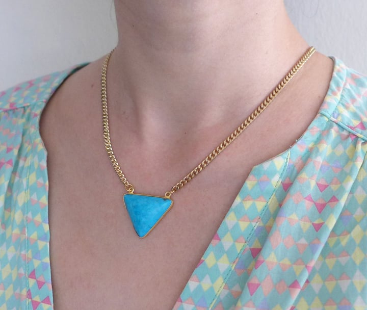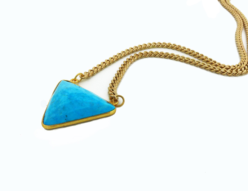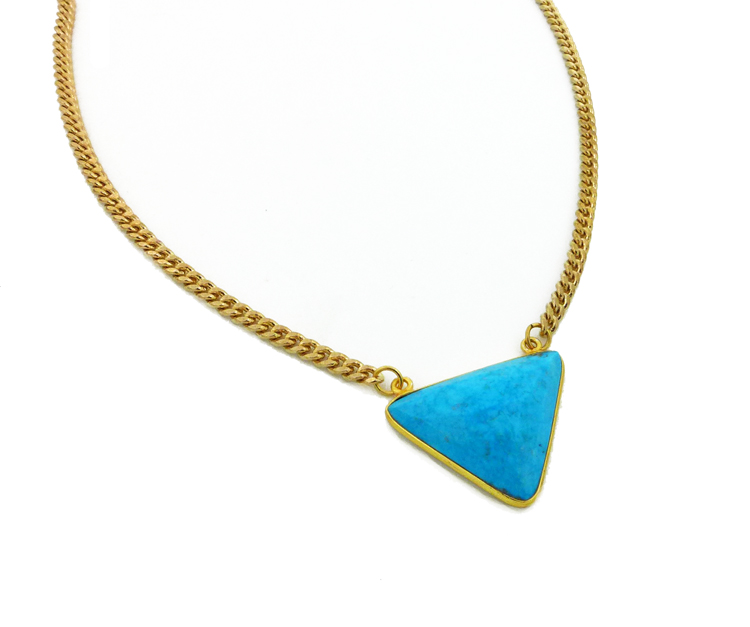 a 24K gold edged triangle shaped turquoise stone suspended from a sturdy gold tone plated curb chain.