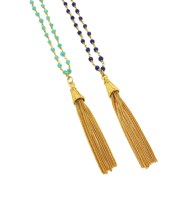 Featuring a long chain tassel suspended from a hand made vermeil, wire wrapped gemstone chain. Necklace measures 30" long.