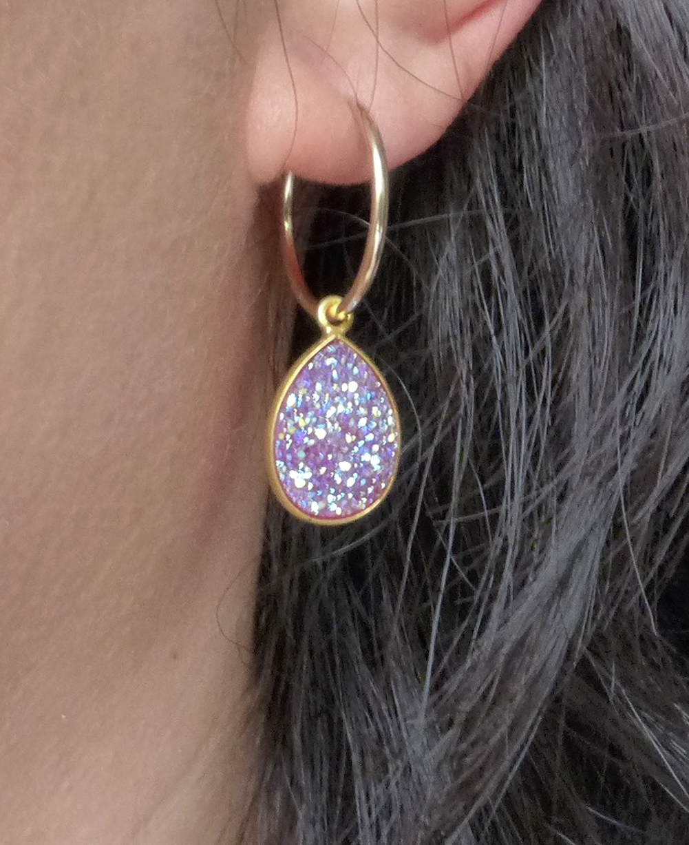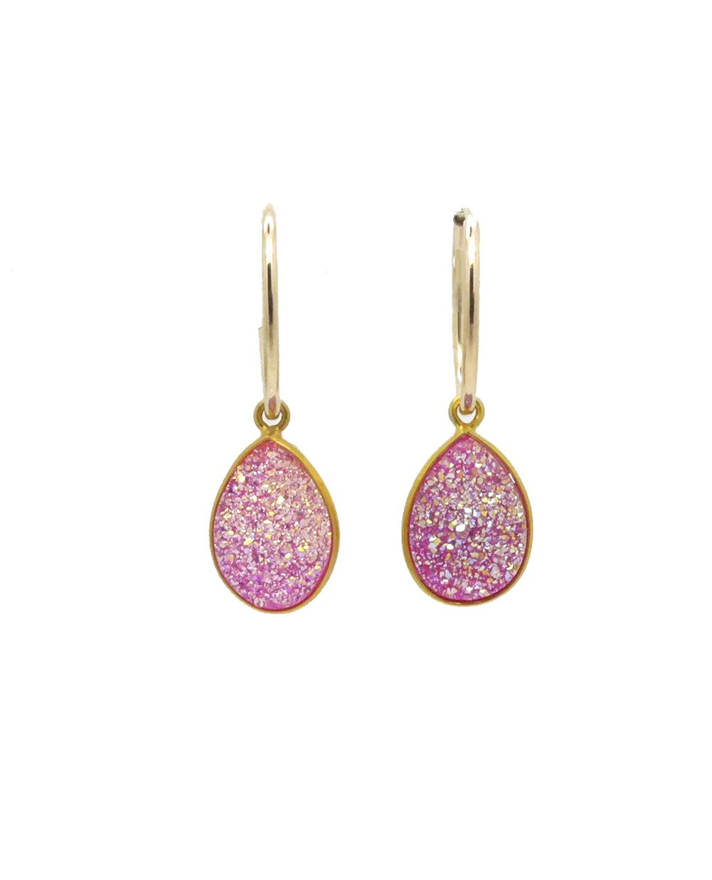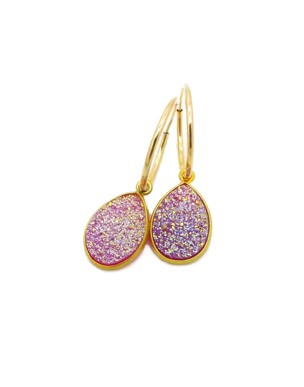 Stylish 14K gold filled hoop earrings with sparkly pink druzy stones set in a 24K gold plated bezel.