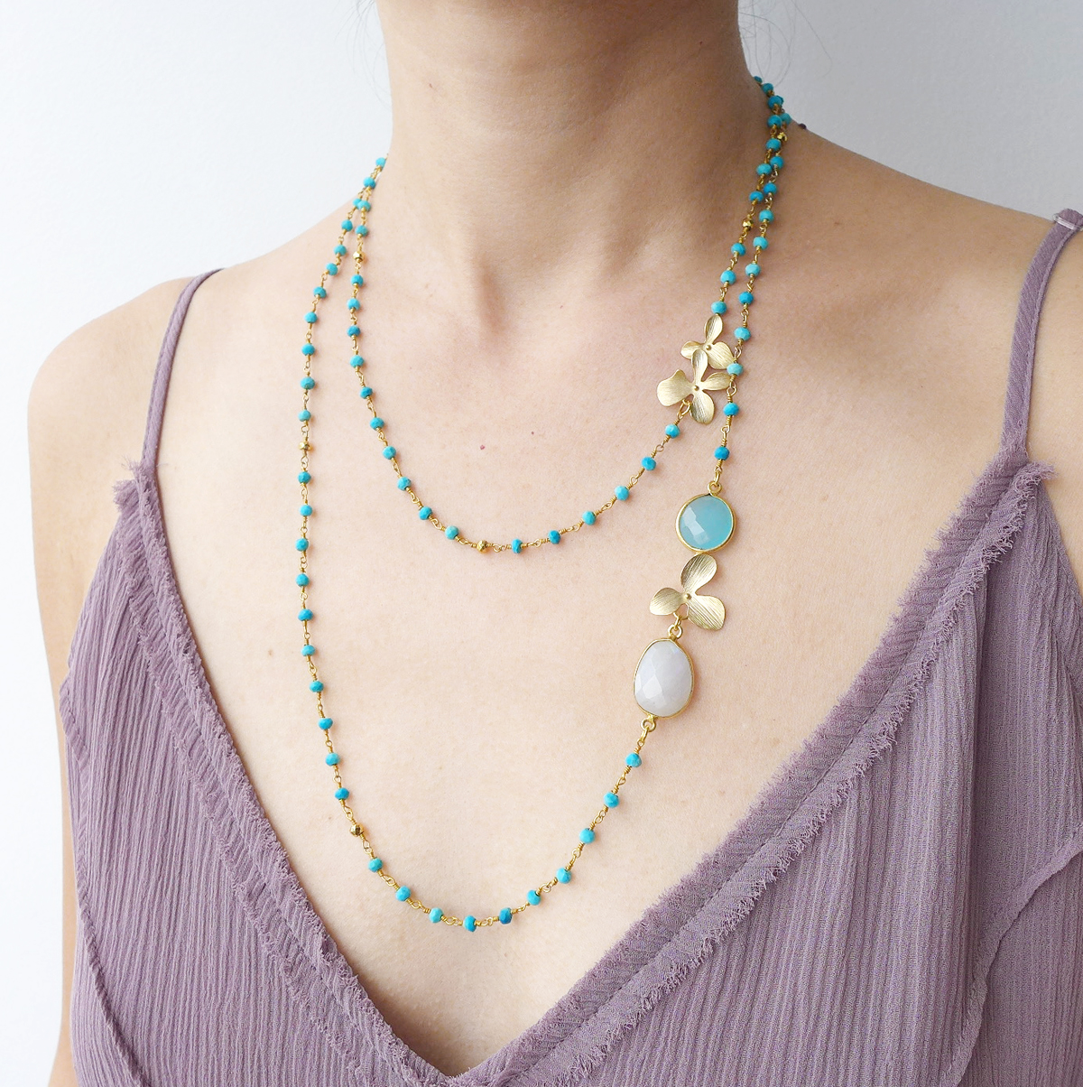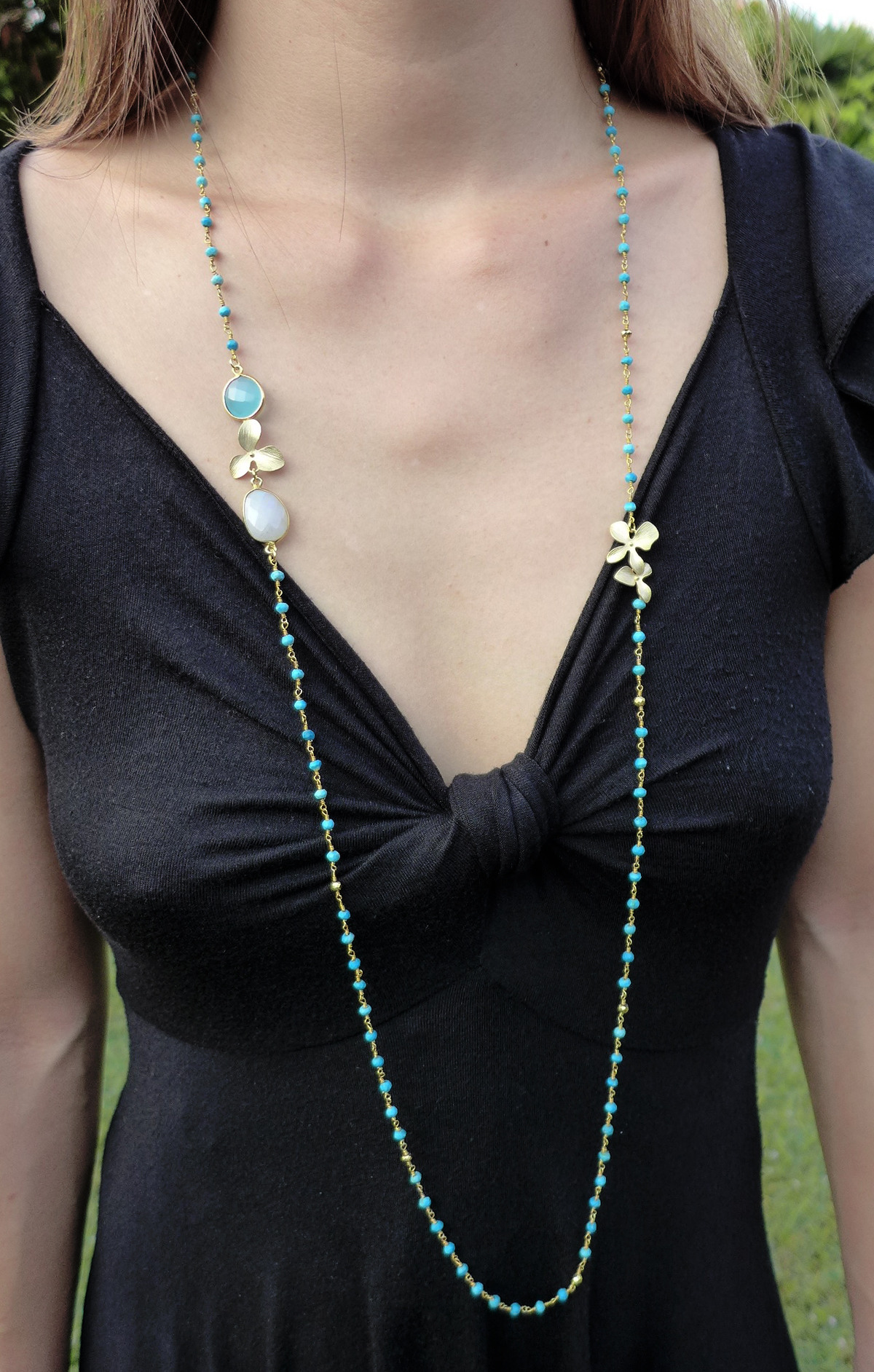 A feminine, classic necklace handmade with aqua chalcedony and moonstone bezelled stones accented with 16K gold plated brass floral motifs.