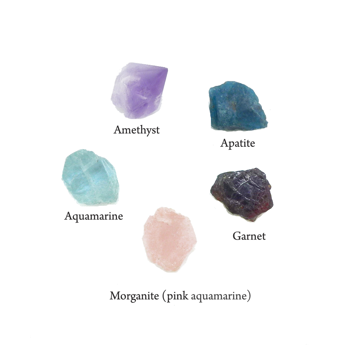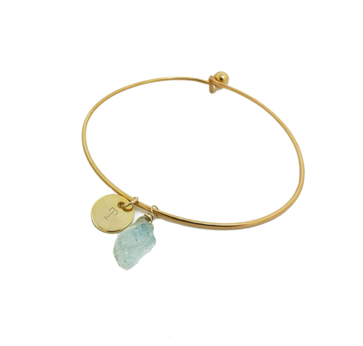 Featuring a charm bangle with a hand stamped letter and accented with a raw, natural gemstone of your choice.
