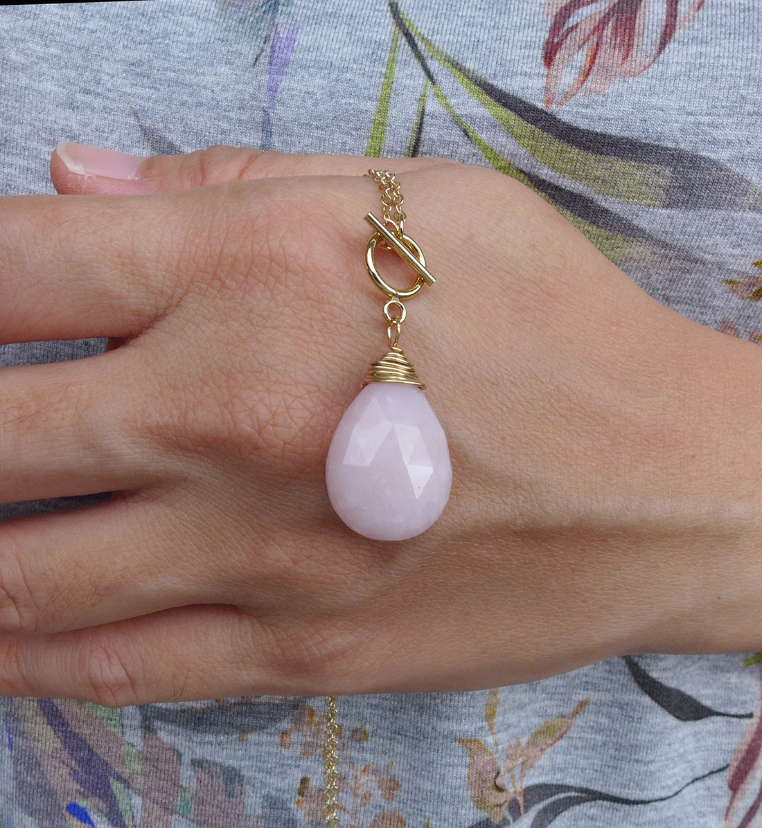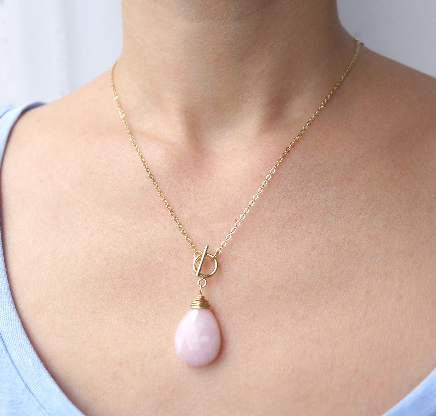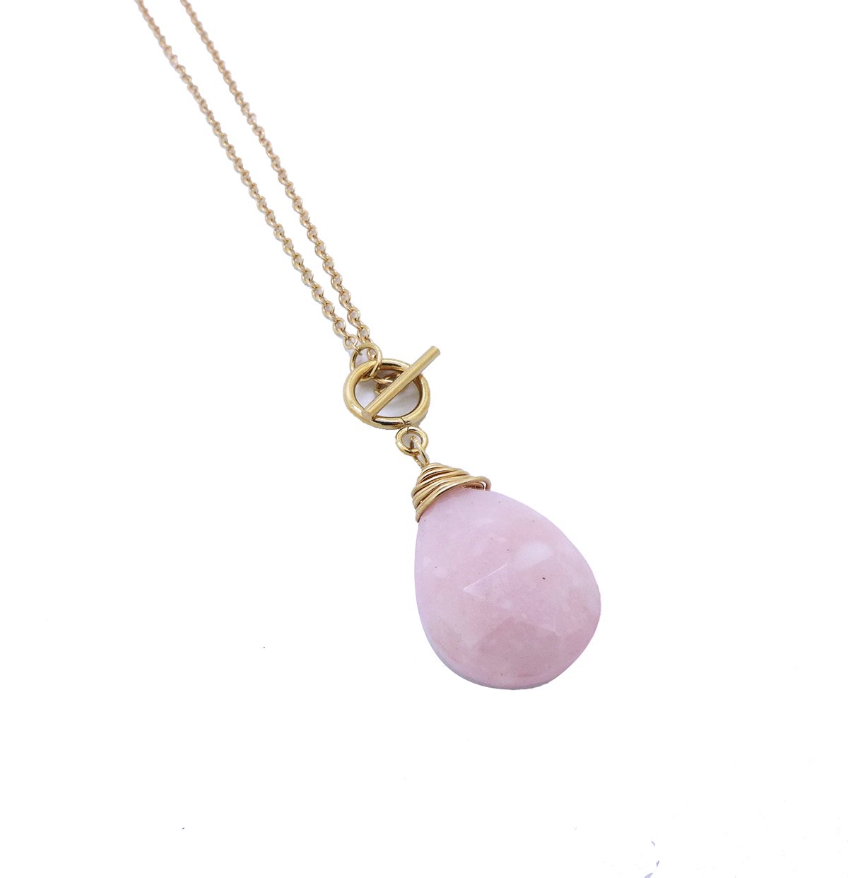 A lovely, genuine pink Peruvian tear drop opal has been hand wired onto a 14k gold filled chain. The toggle and bar closure adds for an