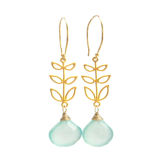 Lovely blue chalcedony teardrops hang from 24K gold vermeil (24K gold plated over sterling silver) branches with delicate leaves. Ear hooks are also 24K vermeil. Total length is about 43mm.