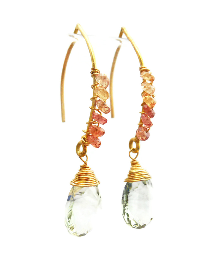 Love the color combination on these earrings! Gorgeous AAA green amethyst drops hang from 14K gold filled ear wires that have AAA songea sapphires entwined around.