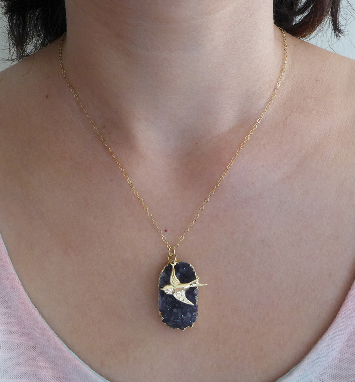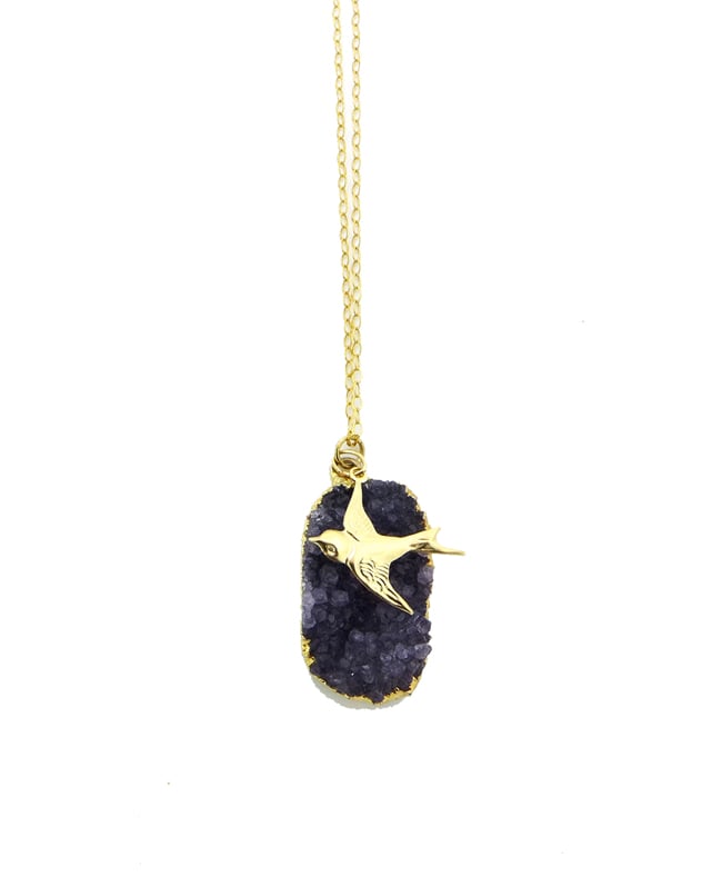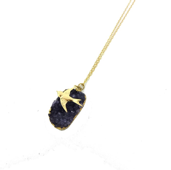 Featuring a lovely midnight - purple druzy pendant accented with a gold filled bird/sparrow charm flying over it.
