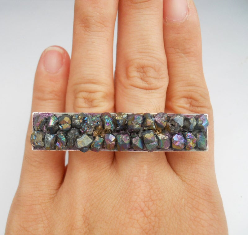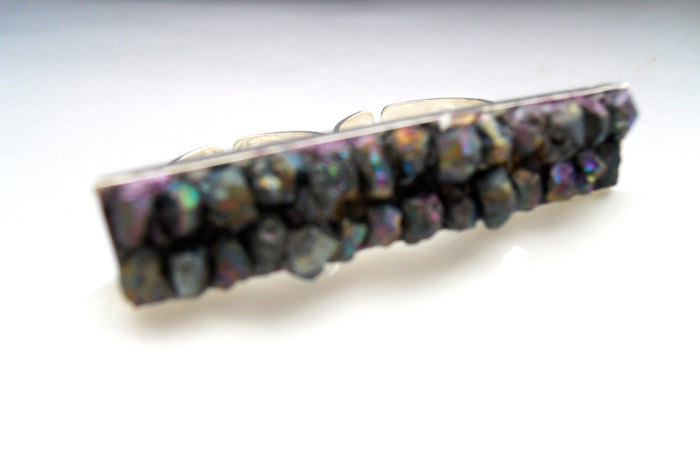 Whoa funky! This is a double ring with 2 rows of titanium pyrite nuggets inlaid onto a silver tone ring base. The rings are adjustable. Top measures about 52mm wide, 11mm high.
