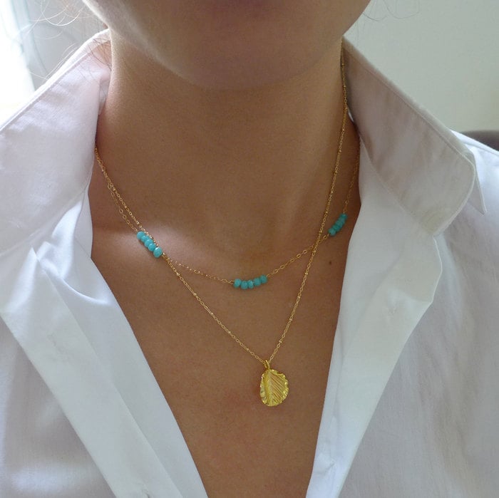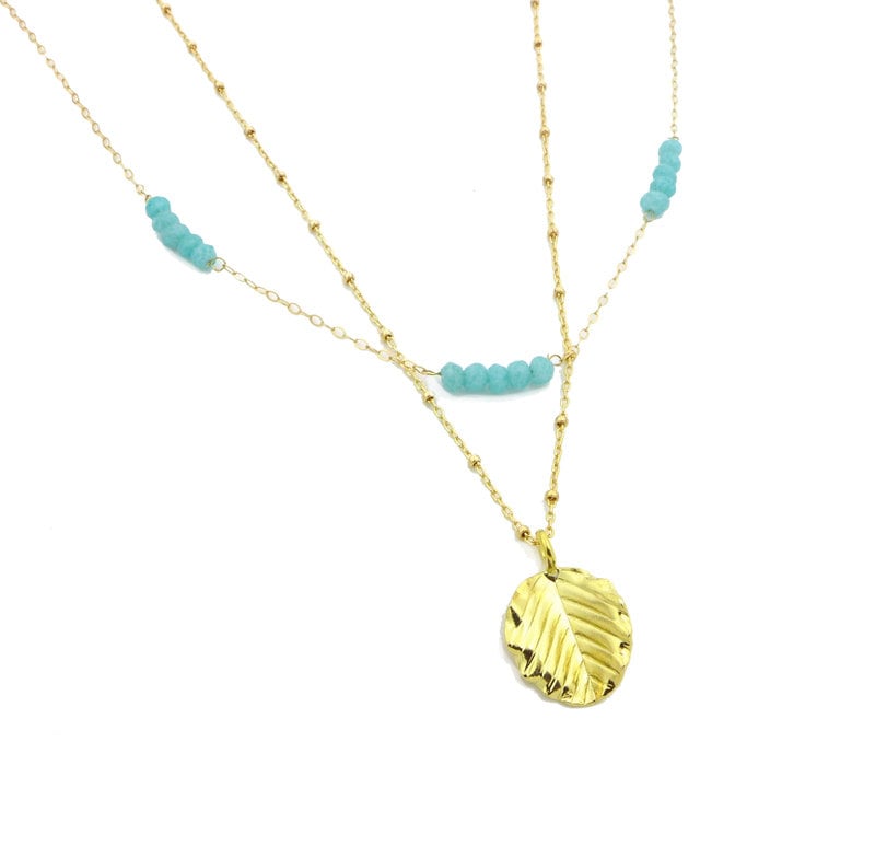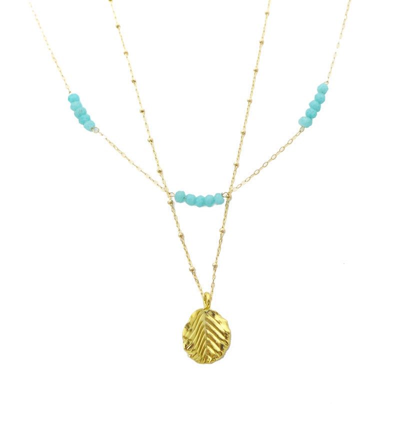 A lovely layered necklace set featuring an aqua chalcedony gemstone necklace and a vermeil leaf necklace.
