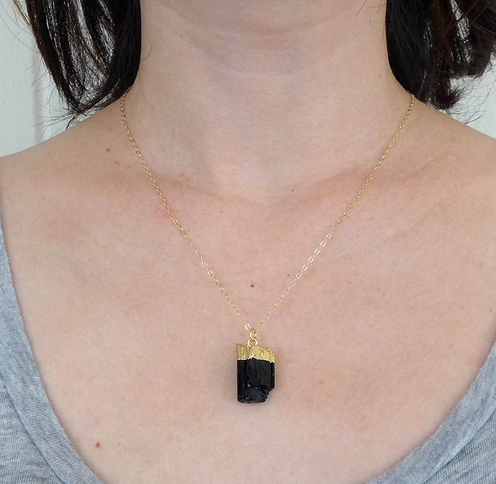 A cute, mini sized raw black tourmaline pendant hangs from a 14K gold filled satellite chain.