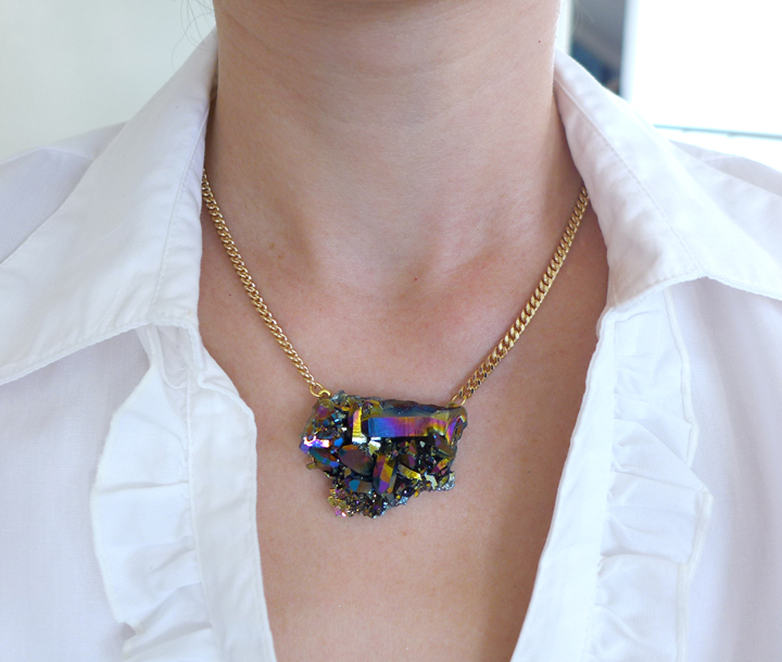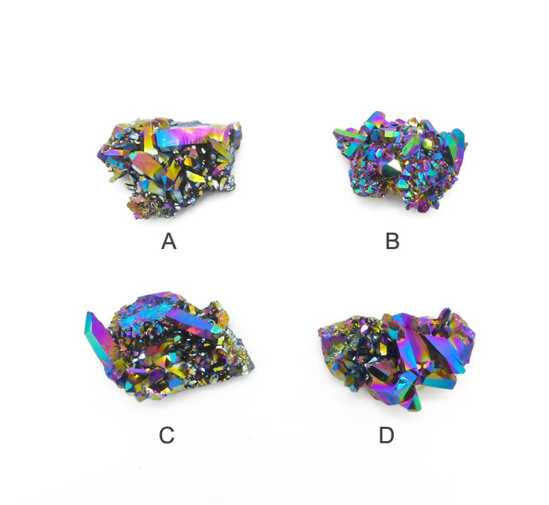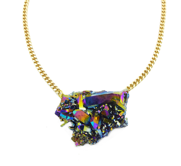 A large crystal cluster has been infused with titanium rainbow colors and attached to
